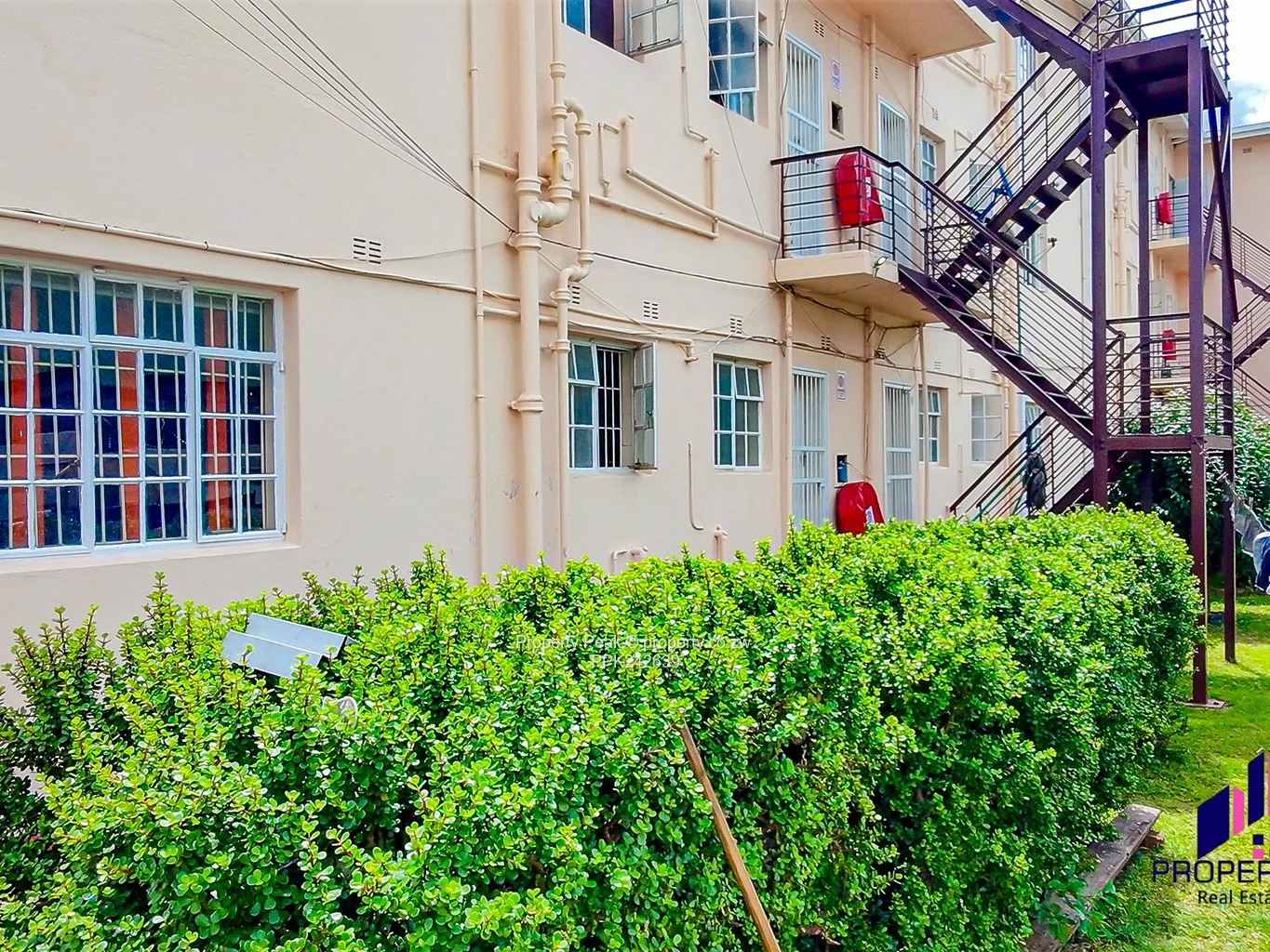 The exterior presents a clean, cream-finished facade with durable metal fire escapes and manicured hedges that frame the building. Interiors feature original wooden floors and bright communal stairwells with polished wooden handrails that create an inviting circulation core. Ground-floor spaces have been used as office/reception areas and show practical layout options for administration or onsite management. Well-positioned windows ensure natural light in most units, and balcony areas on upper floors add tenant appeal.